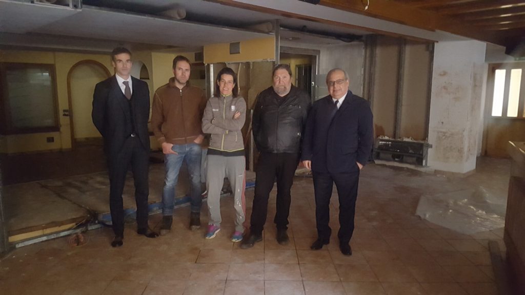 Nella foto: gli interni dell'albergo Nele di Ziano di Fiemme (assicurato ITAS - agenzia di Predazzo) gravemente danneggiati dal maltempo. Da sinistra: Alessandro Molinari (vicedirettore generale ITAS), Diego Zorzi e la sorella Stefania (proprietari albergo Nele), Fabio Vanzetta (sindaco di Ziano di Fiemme), Raffaele Agrusti (amministratore delegato e direttore generale ITAS)
